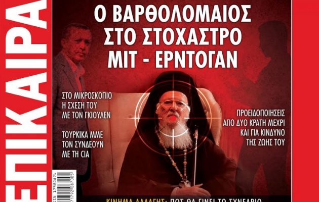 Στο στόχαστρο του ισλαμιστικού καθεστώτος της Άγκυρας και των τουρκικών υπηρεσιών πληροφοριών (MİT) βρίσκεται ο οικουμενικός πατριάρχης Βαρθολομαίος. Με αυτό το αποκαλυπτικό θέμα στο εξώφυλλό του κυκλοφορεί την Παρασκευή 29 Δεκεμβρίου σε όλη την Ελλάδα το περιοδικό ΕΠΙΚΑΙΡΑ.