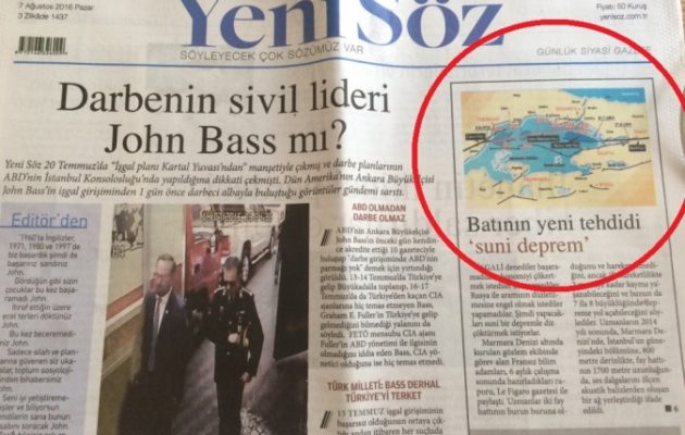 H τουρκική εφημερίδα YENI SOZ στο πρωτοσέλιδο της έχει άρθρο το οποίο αναφέρει ότι η Δύση διαθέτει μηχανισμό πρόκλησης σεισμών τον οποίο θα χρησιμοποιήσει για να πλήξει την Κωνσταντινούπολη το προσεχές διάστημα ως αντίποινα για την αντίδραση του τουρκικού λαού η οποία οδήγησε στην αποτυχία του πραξικοπήματος της 15/7.