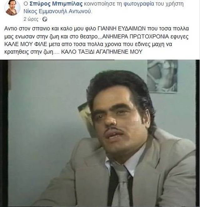 Την είδηση του θανάτου του ανακοίνωσε ο Σπύρος Μπιμπίλας μέσα από τον λογαριασμό του στο Facebook.