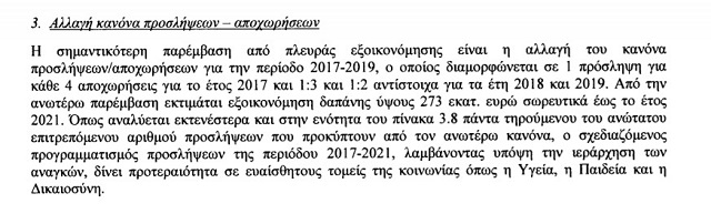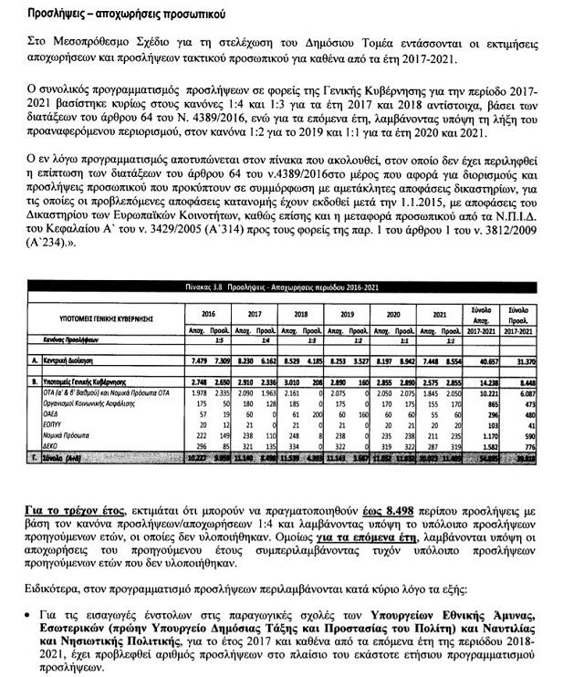 Σύμφωνα με το Μεσοπρόθεσμο φέτος θα πραγματοποιηθούν 8.498 προσλήψεις από τις οποίες 6.162 στην Κεντρική Διοίκηση, 1.963 σε δήμους και περιφέρειες, 128 σε Οργανισμούς Κοινωνικής Ασφάλισης, 110 σε Νομικά Πρόσωπα και 135 σε ΔΕΚΟ.