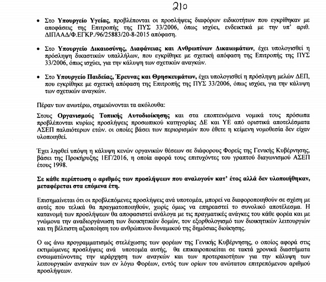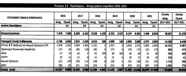 Συνολικά , στην πενταετία θα πραγματοποιηθούν 31.370 προσλήψεις στην Κεντρική Διοίκηση, 6.087 στους ΟΤΑ, 473 στους Οργανισμούς Κοινωνικής Ασφάλισης, 480 στον ΟΑΕΔ, 41 στον ΕΟΠΥΥ, 490 σε Νομικά Πρόσωπα, 776 σε ΔΕΚΟ.