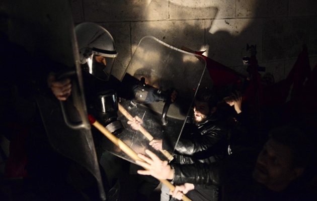 Λίγο νωρίτερα, διαδηλωτές είχαν πετάξει μπογιές στα ΜΑΤ.