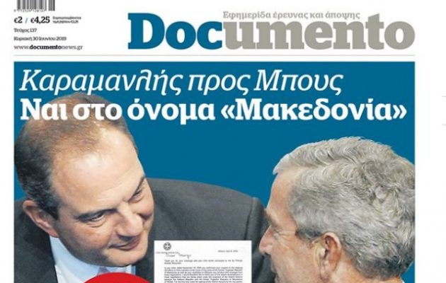 Η επιστολή του Κώστα Καραμανλή στον Τζορτζ Μπους, που δημοσιοποιεί το «Ντοκουμέντο», αναφέρει πρόταση για λύση του Μακεδονικού με το όνομα «Μακεδονία-Σκόπια», που θα έμενε μετά σκέτο «Μακεδονία», χωρίς αναφορά σε συνταγματική αναθεώρηση.