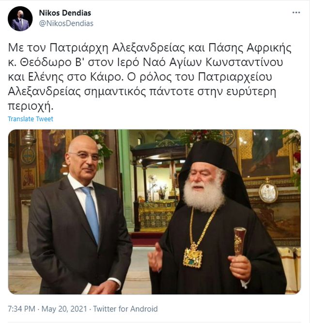«Ο ρόλος του Πατριαρχείου Αλεξανδρείας σημαντικός πάντοτε στην ευρύτερη περιοχή» έγραψε μετά τη συνάντηση στο Twitter ο Νίκος Δένδιας.