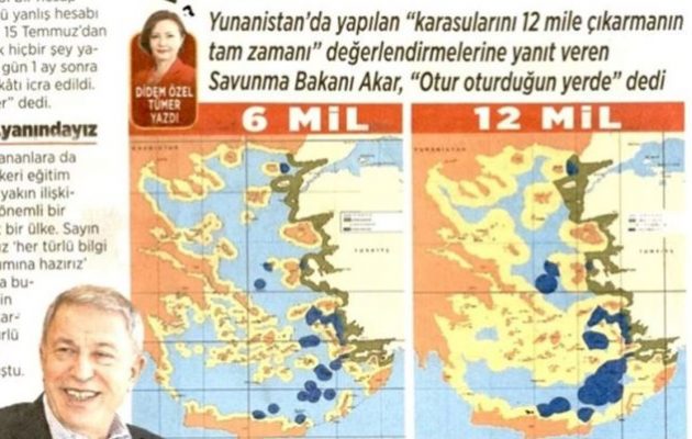 Οι Οινούσες και το Αγαθονήσι είναι δύο από τα ελληνικά νησιά που βρίσκονται μέσα στο μπλε χρώμα στον χάρτη που παρουσίασε το Σάββατο ο Τούρκος υπουργός Άμυνας Χουλουσί Ακάρ και τον οποίο φιλοξενεί στο πρωτοσέλιδό της σήμερα η εφημερίδα Milliyet.