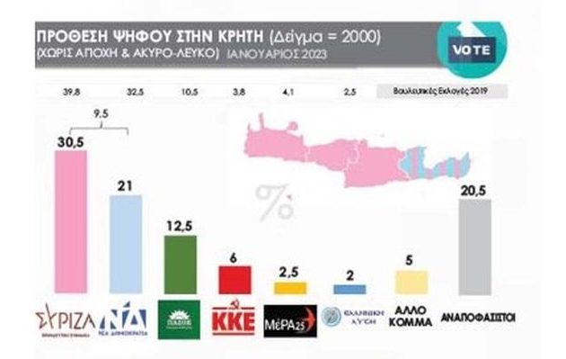 Αναλυτικότερα, σύμφωνα με την έρευνα, η πρόθεση ψήφου στην Κρήτη διαμορφώνεται ως εξής: