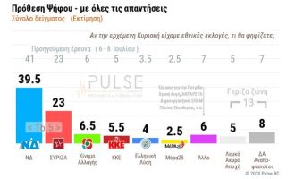 Διαφορά 16 ποσοστιαίων μονάδων διαθέτει η Νέα Δημοκρατία έναντι του ΣΥΡΙΖΑ στην πρόθεση ψήφου, σύμφωνα με δημοσκόπηση της Pulse για…
