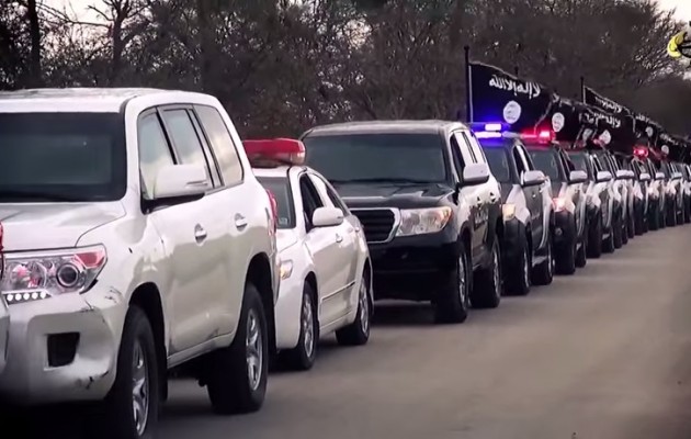 Προφανώς και δεν έχουμε την πραγματική εικόνα για το πόσο ισχυρό είναι το Ισλαμικό Κράτος στη Λιβύη. Ένα νέο βίντεο που αναρτήθηκε στο διαδίκτυο δείχνει ολόκληρο κονβόι από περιπολικά κι άλλα αστυνομικά οχήματα, ολοκαίνουργια, να έχουν περιέλθει στην κατοχή του Ισλαμικού Κράτους και να παρελαύνουν μεγαλοπρεπώς στην πόλη Βεγγάζη της Λιβύης.