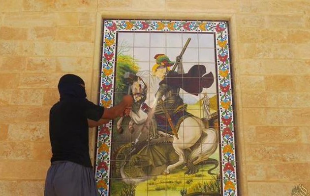 Το Ισλαμικό Κράτος κατέστρεψε εικόνες, βιτρό, αποκαθήλωσε όλους τους σταυρούς και “επιτέθηκε” και στο άγαλμα του Αγίου Γεωργίου με βαριοπούλες. Δείτε τις φωτογραφίες που αναρτήθηκαν στο Twitter.