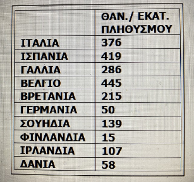 Το ίδιο συμβαίνει και στην Ευρώπη όπως μαρτυρούν τα στοιχεία στον παρατιθέμενο πίνακα που παρουσιάζει το, σχετικά πιο αξιόπιστο στοιχείο, δηλαδή τους θανάτους ανά εκατομμύριο πληθυσμού.