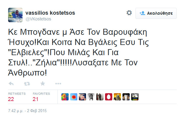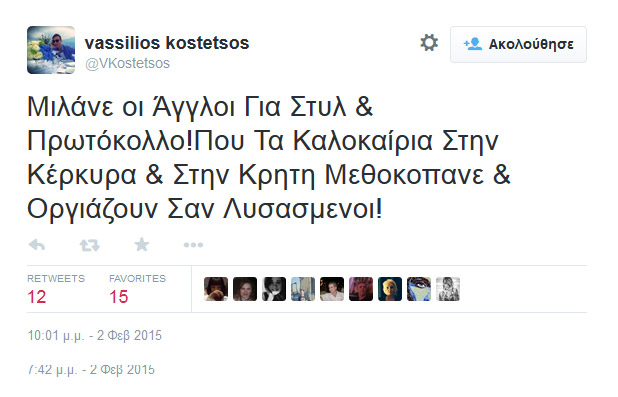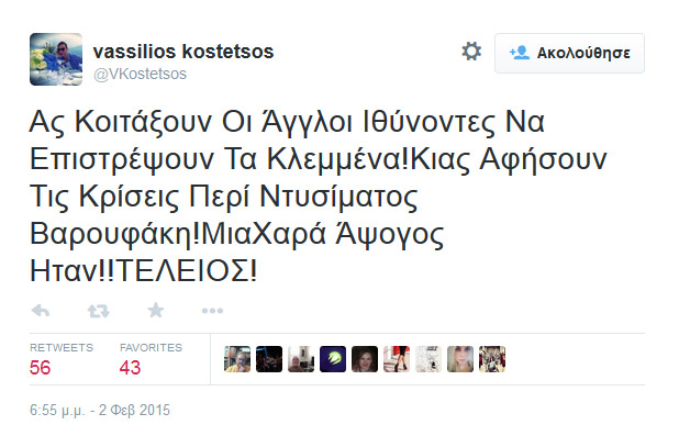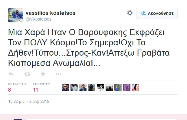 Ο Βασίλειος Κωστέτσος, που είναι πολιτικοποιημένος και σκληρός αντιμνημονιακός (για όσους τον γνωρίζουν) τα πήρε στο κρανίο και άρχισε να τα χώνει, μέσω Twitter, σε όσους σχολίασαν αρνητικά το ντύσιμο του Γιάνη Βαρουφάκη.