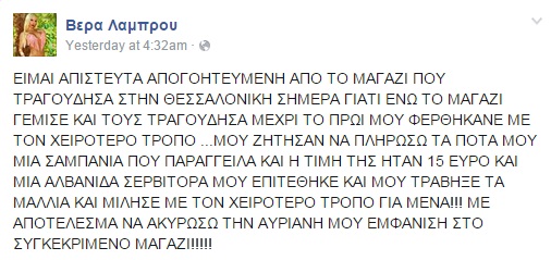 Συγκεκριμένα, η Βέρα Λάμπρου βρέθηκε σε ένα μαγαζί της Θεσσαλονίκης για να τραγουδήσει και όπως ανάρτησε στην προσωπική της σελίδα στο Facebook, κατήγγειλε την επιχείριση, λόγω ανάρμοστης συμπεριφοράς απέναντι της.