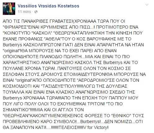 “Από τις πανάκριβες γραβάτες (χρόνιααα τώρα που οι “φιρμάρες” είναι κρυμμένες από πίσω…! Προτιμότερο ένα “κοινότυπο” “κασκόλ”. “Θεωρώ” καταπληκτική την κίνηση που έκανε προφανώς “άθελά” του ο κος Βαρουφάκης με το Burberrys κασκόλ.