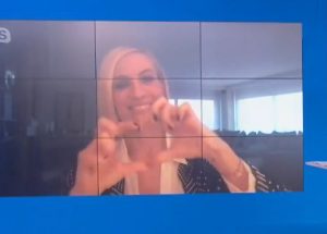 Κρατώντας στο χέρι το διάφανο κυπελλάκι καφέ γνωστής αμερικανικής αλυσίδας. Προσθέτοντας βεβαίως στην όλη της αμερικανιά και μια πινελιά.