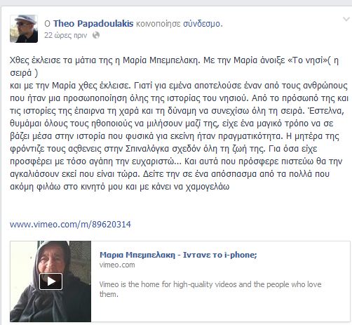 Ο σκηνοθέτης της σειράς, Θοδωρής Παπαδουλάκης, αποχαιρέτησε με το δικό του τρόπο την γιαγιά ποστάροντας στο διαδίκτυο ένα βίντεο που είχε τραβήξει με το κινητό του κατά την διάρκεια των γυρισμάτων της σειράς και έγραψε χαρακτηριστικά: