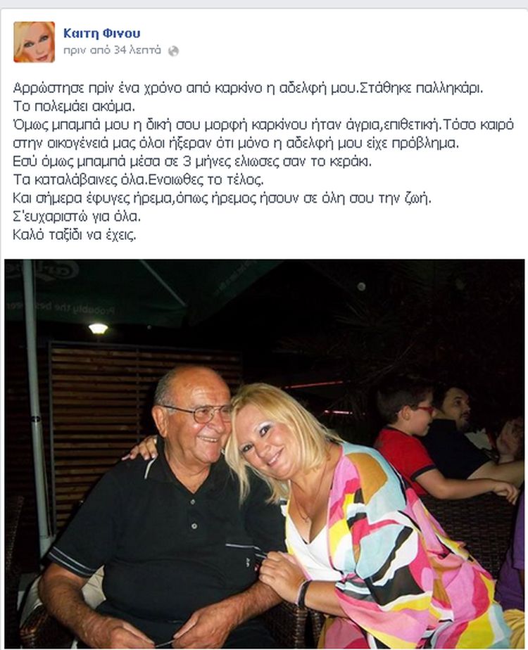 Με δάκρυα στα μάτια και λίγα λουλούδια στα χέρια η ηθοποιός Καίτη Φίνου αποχαιρέτησε τον πολυαγαπημένο της πατέρα ο οποίος έφυγε χτυπημένος από τον καρκίνο.