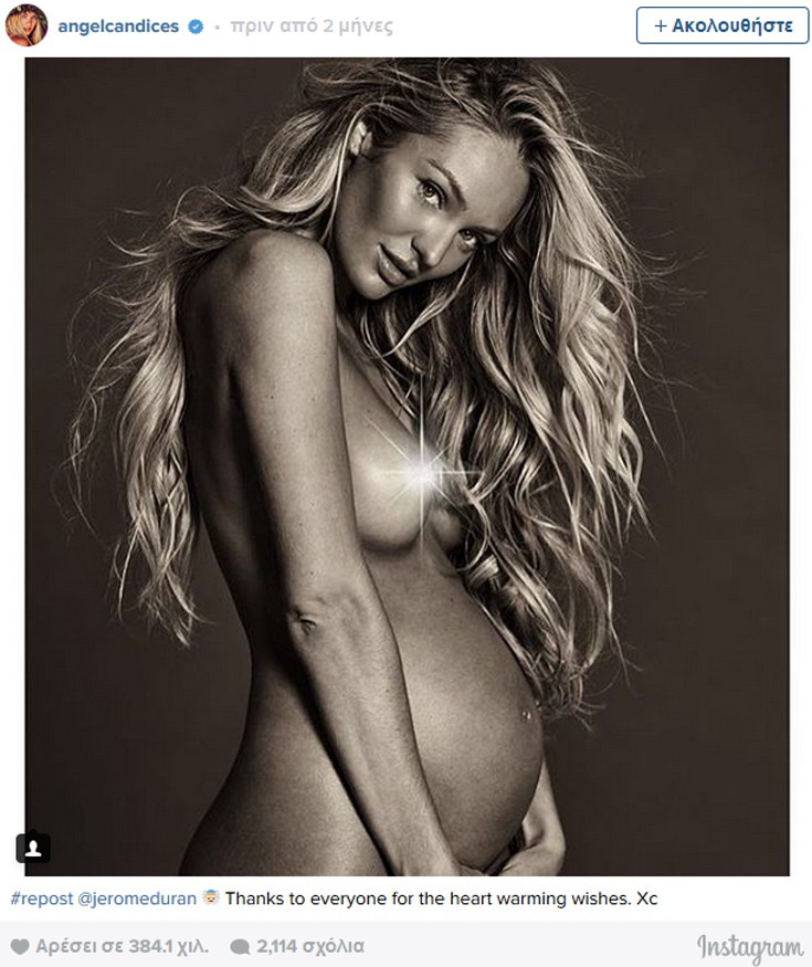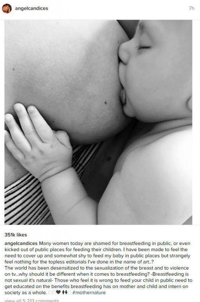 «Έχω νιώσει την ανάγκη τα καλύψω το στήθος μου και να νιώσω ντροπή ενώ θηλάζω το μωρό μου σε δημόσιους χώρους, ωστόσο δεν έχω νιώσει ποτέ ντροπή για τις τόπλες φωτογραφήσεις που έχω κάνει στο όνομα της τέχνης. Ο κόσμος δεν σοκάρεται πια με την εικόνα του γυμνού στήθους και τη βία στην τηλεόραση… γιατί θα πρέπει να είναι διαφορετικά όταν πρόκειται για το θηλασμό;», συνέχισε η Candice.