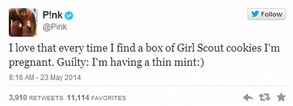 “Αγαπώ κάθε φορά που βρίσκω ένα κουτί με μπισκότα “Grils Scout” είμαι έγκυος. Είμαι ένοχη: Τρώω ένα μπισκοτάκι μέντας”, πόσταρε η 34χρονη Pink και… πυροδότησε τις φήμες.