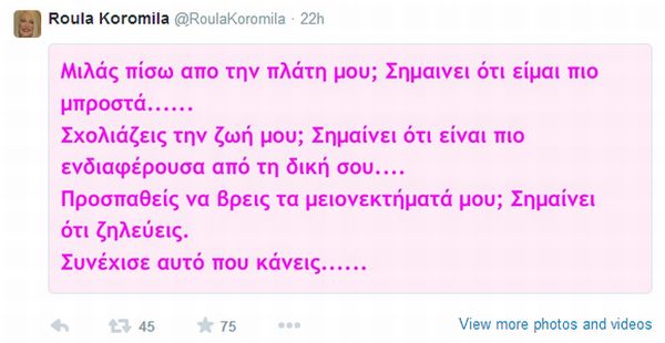 Η Ρούλα Κορομηλά δεν έμεινε άπραγη και αποφάσισε να απαντήσει με σκληρό τρόπο μέσα από το προσωπικό της προφίλ στο twitter: