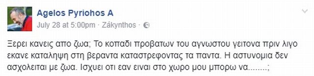 “Ξερει κανεις απο ζωα; Το κοπαδι προβατων του αγνωστου γειτονα πριν λιγο εκανε καταληψη στη βεραντα καταστρεφοντας τα παντα. Η αστυνομια δεν ασχολειται με ζωα. Ισχυει οτι εαν ειναι στο χωρο μου μπορω να……..;”.
