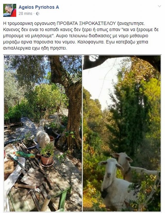 “Η τρομοαρνικη οργανωση ΠΡΟΒΑΤΑ ΞΗΡΟΚΑΣΤΕΛΟΥ ξαναχτυπησε. Κανενος δεν ειναι το κοπαδι κανεις δεν ξερει ή οπως ειπαν “και να ξερουμε δε μπορουμε να μιλησουμε”. Αυριο τελειωνω διαδικασιες με νομο μεθαυριο μοιραζω αρνια παρουσια του νομου. Καλοφαγωτα. Εγω κατεβαζω χαπια αντιαλλεργικα εχω ηδη πρηστει”.