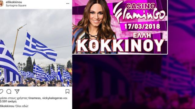 Αναντιστοιχία λόγων και πράξεων για την τραγουδίστρια Έλλη Κοκκίνου που αν και ήταν παρούσα στο συλλαλητήριο της Αθήνας για την Μακεδονία διαδηλώνοντας με πάθος για το θέμα της ονομασίας και ανεβάζοντας φωτογραφίες στο instagram από το συγκεντρωμένο πλήθος στην πλατεία Συντάγματος, την ίδια στιγμή απαντούσε θετικά σε δελεαστική πρόταση για εμφάνιση από καζίνο των Σκοπίων.