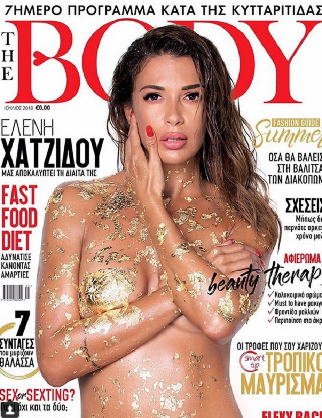 Στο εξώφυλλο η Ελένη ποζάρει topless με φύλλα χρυσού να καλύπτουν μέρος της επιδερμίδας της, ενώ στη συνέντευξη που το συνοδεύει μοιράζεται τα μυστικά της δίαιτάς της.