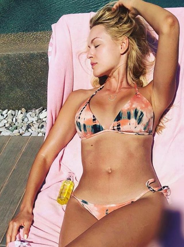 Η Βίκυ Κάβουρα φοράει ένα πολύ όμορφο σε σχέδιο μπικίνι και κάνει ηλιοθεραπεία πάνω στην ξαπλώστρα της.