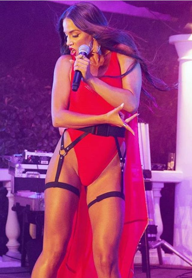 Φορώντας μόνο ένα κατακόκκινο κορμάκι και μια ζώνη που κατέληγε… σε ζαρτιέρες, η Κατερίνα ανέβηκε στη σκηνή και έβαλε «φωτιά».