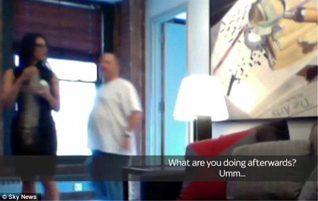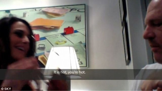 Στις εικόνες που μετέδωσε το Sky News ο Χάρβεϊ Γουάινσταϊν εμφανίζεται να ρωτάει την Τόμπσον «μπορώ να σε φλερτάρω;» με την 28χρονη να απαντά «χμ, θα το δούμε».