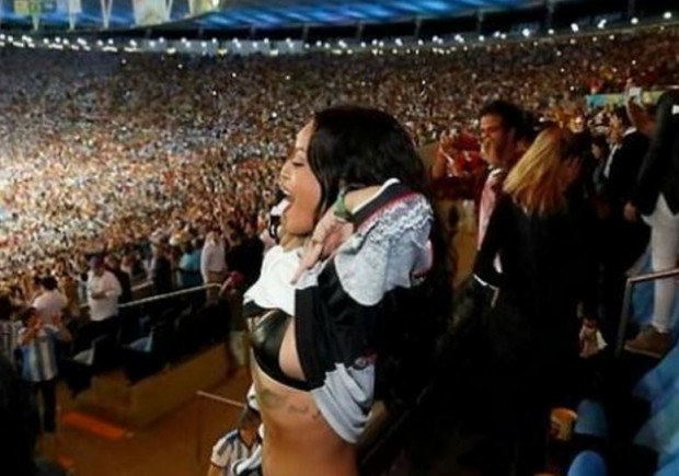 Στο γκολ του Γκέτσε θέλοντας να εκδηλώσει την… χαρά τη δεν βρήκε πιο κατάλληλο για Ριάνα τρόπο να πανηγυρίσει παρά να σηκώσει την μπλούζα της διαχέοντας τον ενθουσιασμό της σε όλο τον αντρικό πληθυσμό.