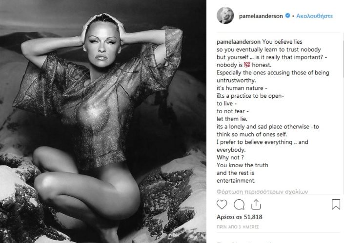 Η Πάμελα Άντερσον ποζάρει με μία διάφανη μπλούζα και με καυτή διάθεση σε φωτογραφία της στο Instagram και μιλάει για την ειλικρίνεια αλλά και το ψέμα.
