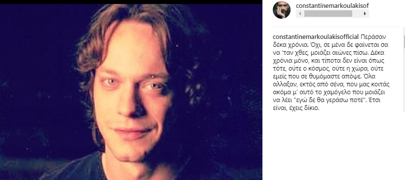»Όλα άλλαξαν εκτός από σένα που μας κοιτάζεις ακόμα με αυτό το χαμόγελο που μοιάζει να λέει “Εγώ δεν θα γεράσω ποτέ”. Έτσι είναι έχεις δίκιο», έγραψε χαρακτηριστικά ο Κωνσταντίνος Μαρκουλάκης στη λεζάντα της φωτογραφίας.