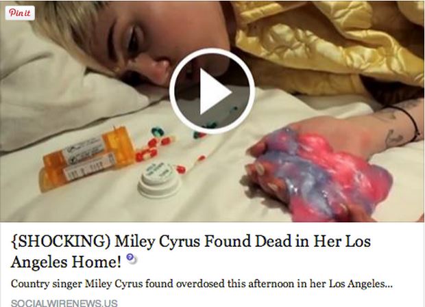 “Σοκ: Η Μάιλι Σάιρους βρέθηκε νεκρή στο σπίτι της στο Λος Άντζελες” έγραφε το μήνυμα στα social media και συνοδευόταν με μια φωτογραφία που έδειχνε την τραγουδίστρια πάνω στο κρεβάτι και δίπλα της χάπια που υποτίθεται είχε πάρει για να αυτοκτονήσει.