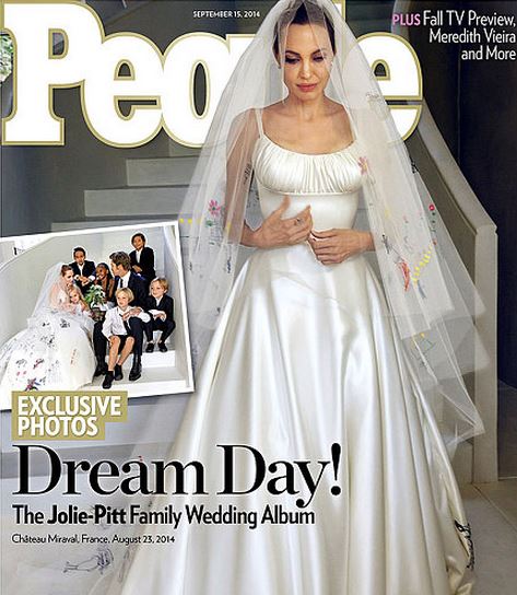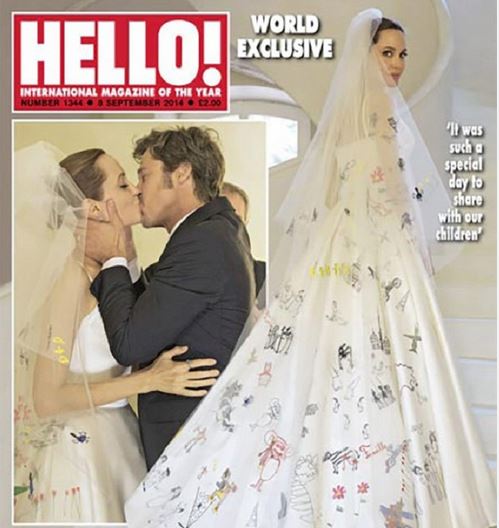 Στις αποκλειστικές φωτογραφίες, που παρουσιάζουν τα περιοδικά Hello κι People, μπορείτε να θαυμάσετε την Αντζελίνα Τζολί με το νυφικό που σχεδίασε ο κορυφαίος μόδιστρος του οίκου Βερσάτσε, Luigi Massi, με την βοήθεια των παιδιών της οικογένειας, που είχαν ζωγραφίσει πάνω στο λευκό νυφικό τα δικά τους σχήματα και παραστάσεις.