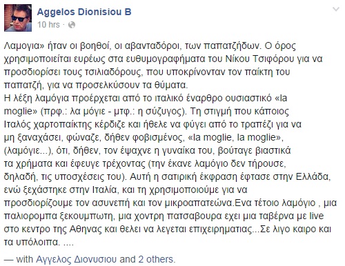 Αυτή η σατιρική έκφραση έφτασε στην Ελλάδα, ενώ ξεχάστηκε στην Ιταλία, και τη χρησιμοποιούμε για να προσδιορίζουμε τον ασυνεπή και τον μικροαπατεώνα. Ένα τέτοιο λαμόγιο , μια παλιορομπα ξεκούμπωτη, μια χοντρή πατσαβούρα έχει μια ταβέρνα με live στο κέντρο της Αθήνας και θέλει να λέγεται επιχειρηματιας… Σε λίγο καιρό και τα υπόλοιπα…» έγραψε στον προσωπικό του λογαριασμό στο Facebook.