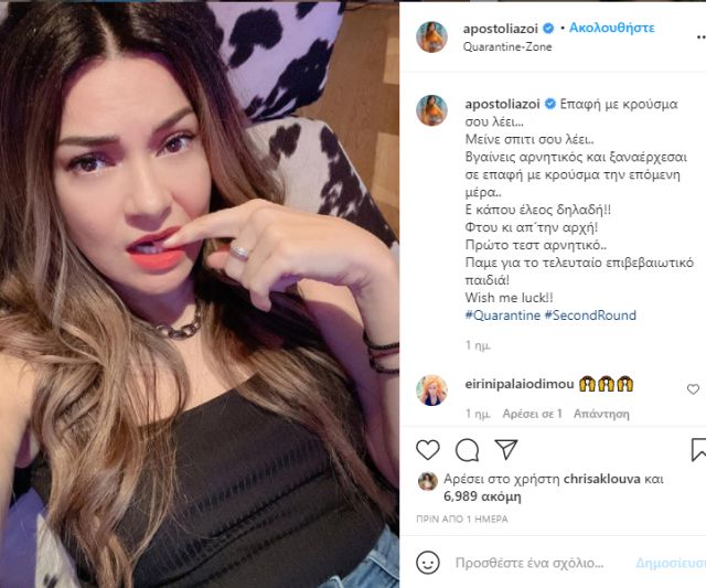 Η τραγουδίστρια Αποστολία Ζώη μερικές μέρες πριν είχε έρθει σε επαφή με κρούσμα και αυτόματα μπήκε σε καραντίνα.