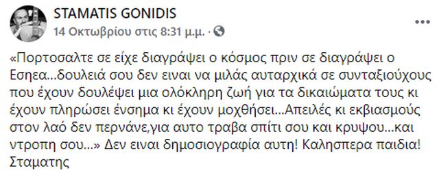Δεν είναι η πρώτη φορά που ο Σταμάτης Γονίδης σχολιάζει την επικαιρότητα. Η πιο πρόσφατη περίπτωση, αφορά τη διαγραφή του Άρη Πορτοσάλτε από την ΕΣΗΕΑ, αλλά και ορισμένες δηλώσεις του δημοσιογράφου για τους συνταξιούχους.