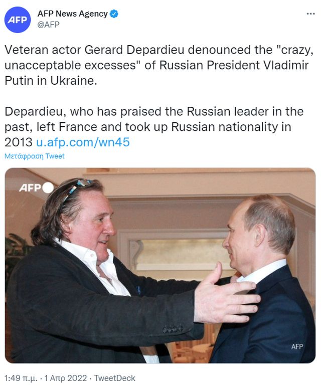Μπορεί στο παρελθόν να έχει εξάρει τον Βλαντίμιρ Πούτιν, τώρα όμως ο Γάλλος ηθοποιός Ζεράρ Ντεπαρντιέ επέκρινε τις «τρελές, απαράδεκτες ακρότητες» του Ρώσου προέδρου στην Ουκρανία.