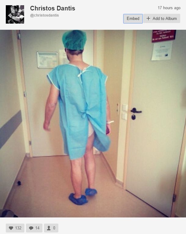 Ο τραγουδιστής “ανέβασε” φωτογραφία του από το νοσοκομείο, ο οποίος απεικονίζεται με τη ρόμπα του χειρουργείου, φορώντας από μέσα μόνο το εσώρουχό του.