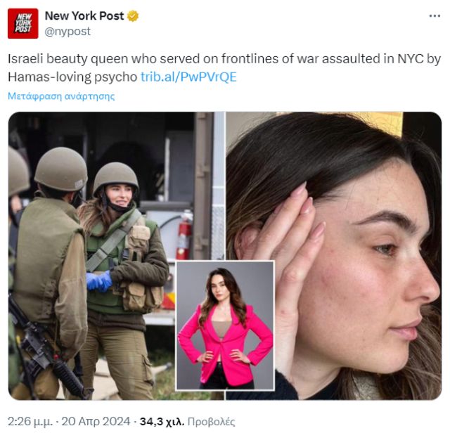 Μια βασίλισσα ομορφιάς, η οποία βρίσκεται στην πρώτη γραμμή του πολέμου Ισραήλ-Χαμάς από τη σφαγή της 7ης Οκτωβρίου δέχθηκε επίθεση κατά τη διάρκεια μιας διαμαρτυρίας υπέρ της Χαμάς στην Times Square στη Νέα Υόρκη, σύμφωνα με τη New York Post.