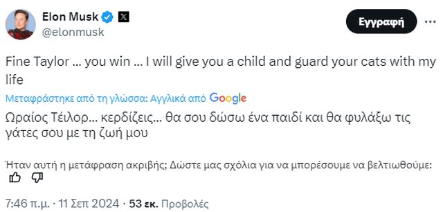 «Ωραία Τέιλορ … Κέρδισες … Θα σου χαρίσω ένα παιδί και θα φυλάω τις γάτες σου με τη ζωή μου», έγραψε ο Μασκ.