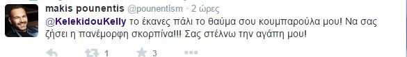 Την χαρμόσυνη είδηση έκανε γνωστή ο κουμπάρος του ζευγαριού, Μάκης Πουνέντης, ο οποίος έστειλε της ευχές της στην Κέλλυ Κελεκίδου μέσω του προσωπικού του λογαριασμού στο twitter: