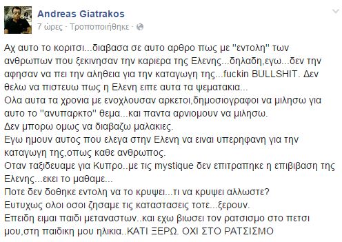 “Αχ αυτό το κορίτσι…διάβασα σε αυτό άρθρο πως με ”εντολή” των ανθρώπων που ξεκίνησαν την καριέρα της Ελένης…δηλαδή,εγώ…δεν την άφησαν να πει την αλήθεια για την καταγωγή της…fuckin BULLSHIT. Δεν θέλω να πιστεύω πως η Ελένη είπε αυτά τα ψεματάκια” έγραψε στην προσωπική του σελίδα στο Facebook ο Ανδρέας Γιατράκος, που ήταν μάνατζερ της Φουρέιρα.