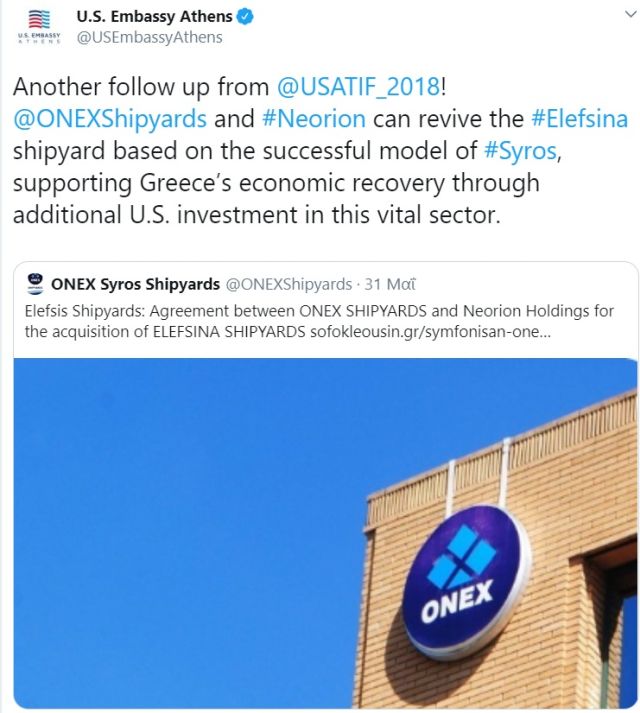 Μόλις έγινε γνωστό από την ONEX το deal με τα ναυπηγεία Ελευσίνας, άμεση ήταν και η αντίδραση της Αμερικανικής πρεσβείας που έσπευσε να συγχαρεί γι’ αυτή τη συμφωνία και το μέλλον της ναυπηγικής στην Ελλάδα.