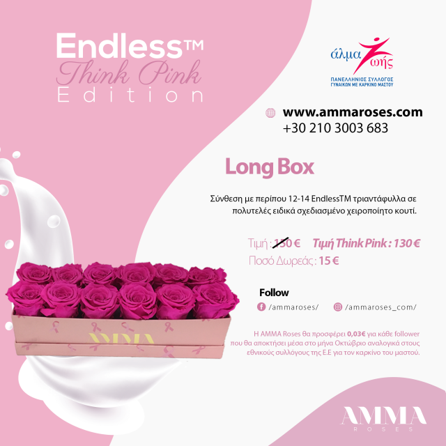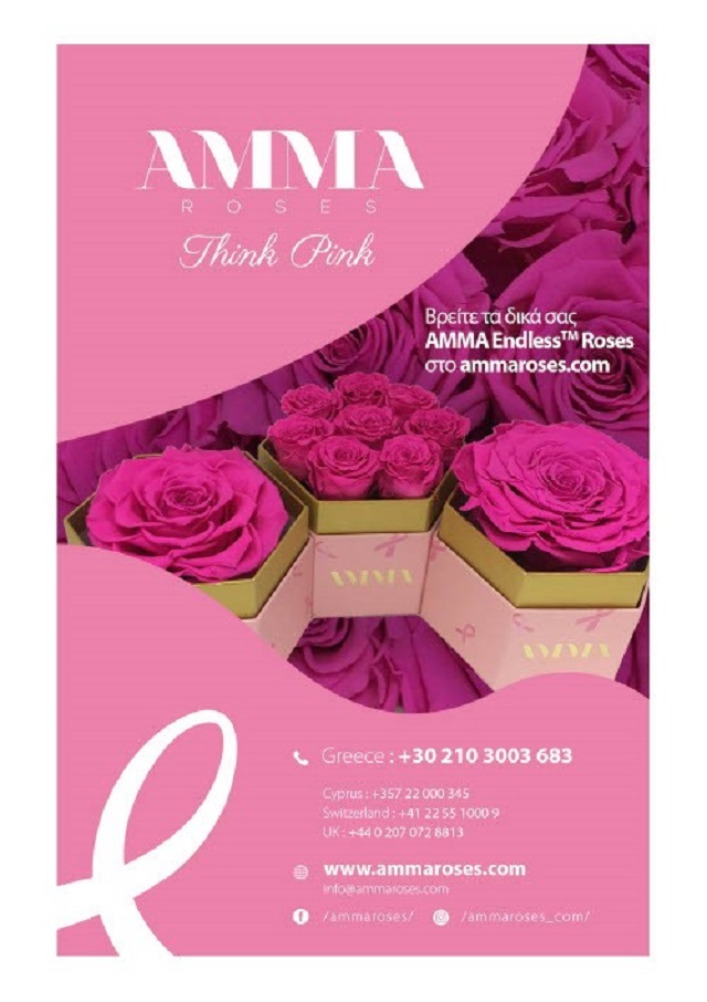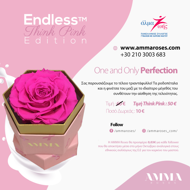 Η ΑΜΜΑ ROSES, το κορυφαίο brand στην Ευρώπη με αληθινά τριαντάφυλλα από ιδιαίτερες ποικιλίες μόνο από το Εκουαδόρ, που διατηρούνται φρέσκα χωρίς φροντίδα για 5 χρόνια, παρουσιάζει τον Οκτώβριο μήνα τη συλλογή «Endless RosesΤΜ Think Pink Edition» με το τριαντάφυλλο στο χρώμα του Pink Ribbon σε ειδικές πολυτελείς συνθέσεις.