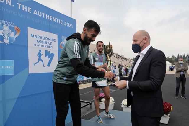 Ο Γιαν Κάρας, Διευθύνων Σύμβουλος ΟΠΑΠ, βραβεύει τον Κωνσταντίνο Γκελαούζο, μεγάλο νικητή του 38ου Αυθεντικού Μαραθωνίου.