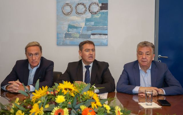 Νίκος Σταθάκης, Διευθύνων Σύμβουλος ΗΛΕΚΤΩΡ και νόμιμος εκπρόσωπος της Αναδόχου Κοινοπραξίας, Ιωάννης Σέγκος, Δήμαρχος Χερσονήσου και Πρόεδρος του ΔΣ του ΦοΔΣΑ Βόρειας Πεδιάδας, και Σταύρος Αρναουτάκης, Περιφερειάρχης Κρήτης