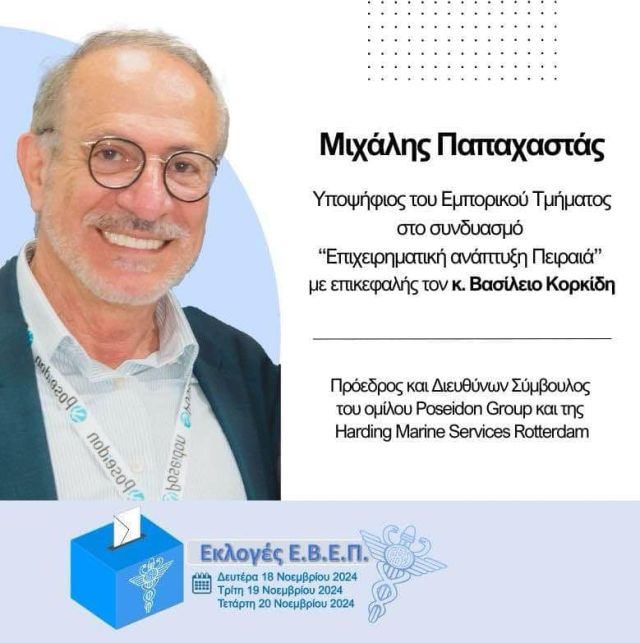 Ο Μιχάλης Παπαχαστάς είναι υποψήφιος του Εμπορικού Τμήματος στον συνδυασμό «Επιχειρηματική Ανάπτυξη Πειραιά» με επικεφαλής τον Βασίλη Κορκίδη.