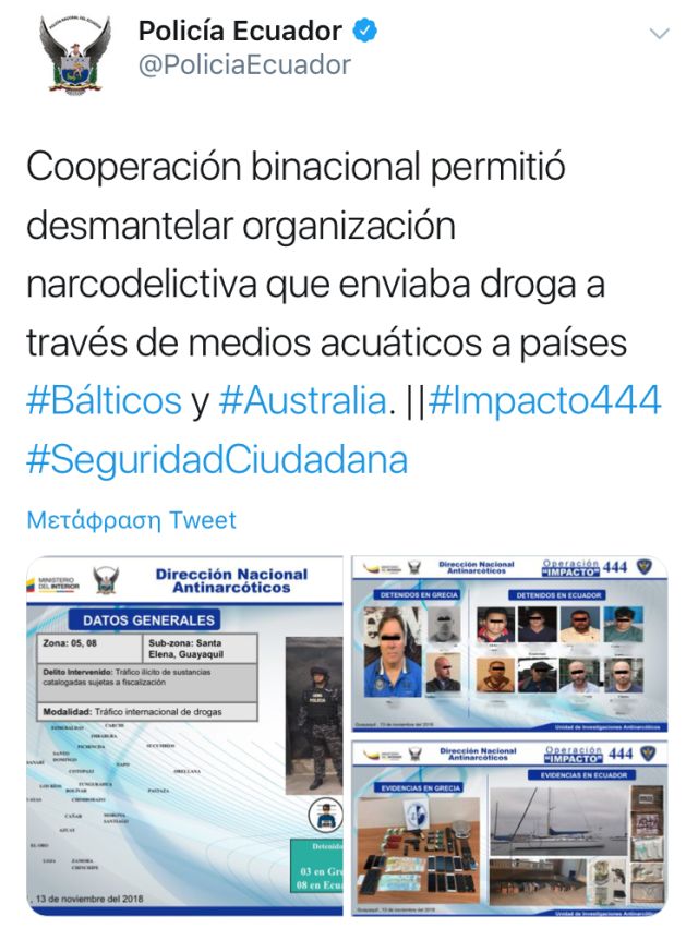 Συνολικά, σύμφωνα με τις αρμόδιες αρχές για τη συγκεκριμένη υπόθεση έχουν συλληφθεί εννέα άτομα, έξι στον Ισημερινό και τρεις στην Ελλάδα.